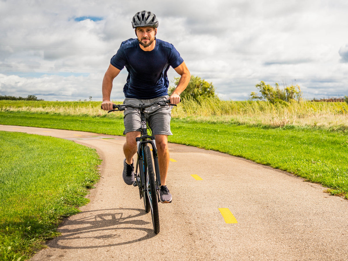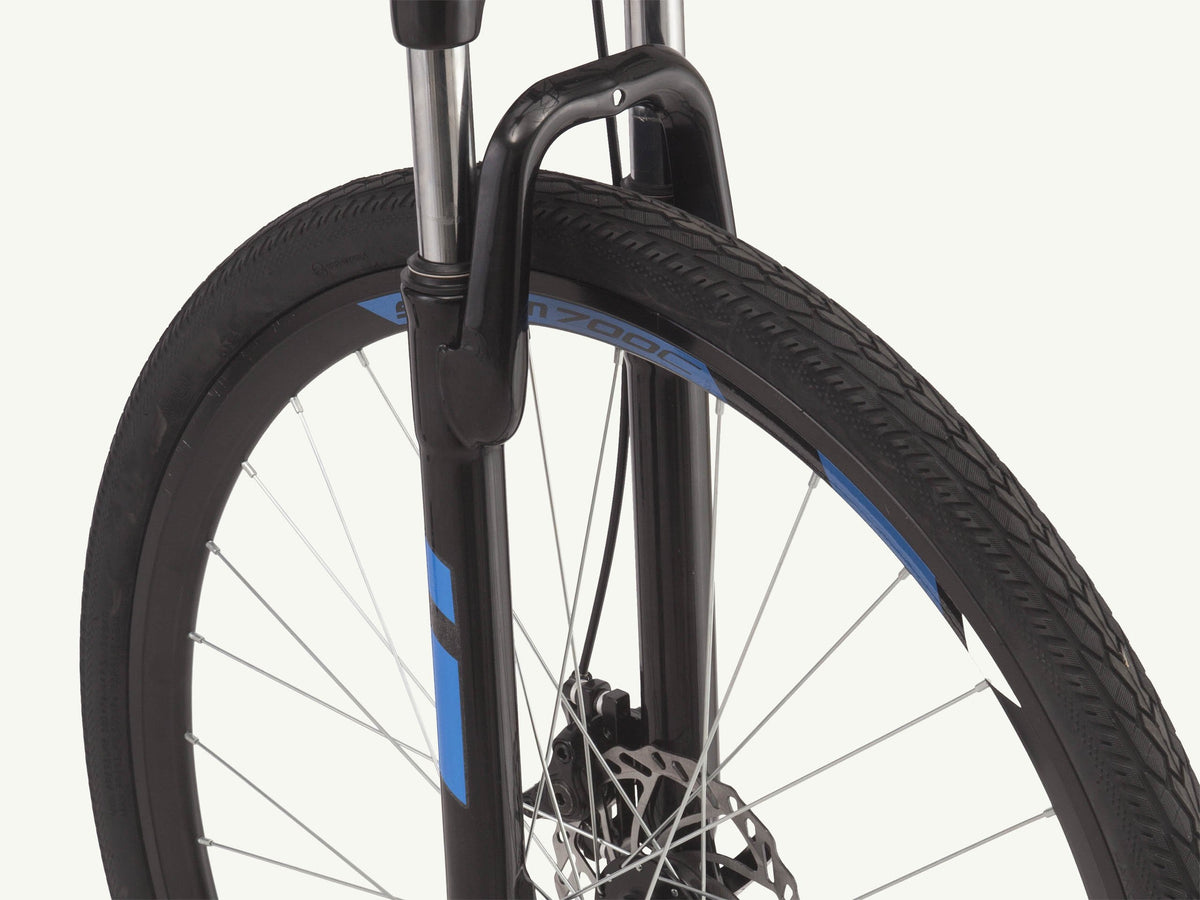 Schwinn aluminum dual sport frame offers lightweight durability, while the Schwinn suspension fork helps absorb bumps in the road or path. Great for versatile riding conditions.