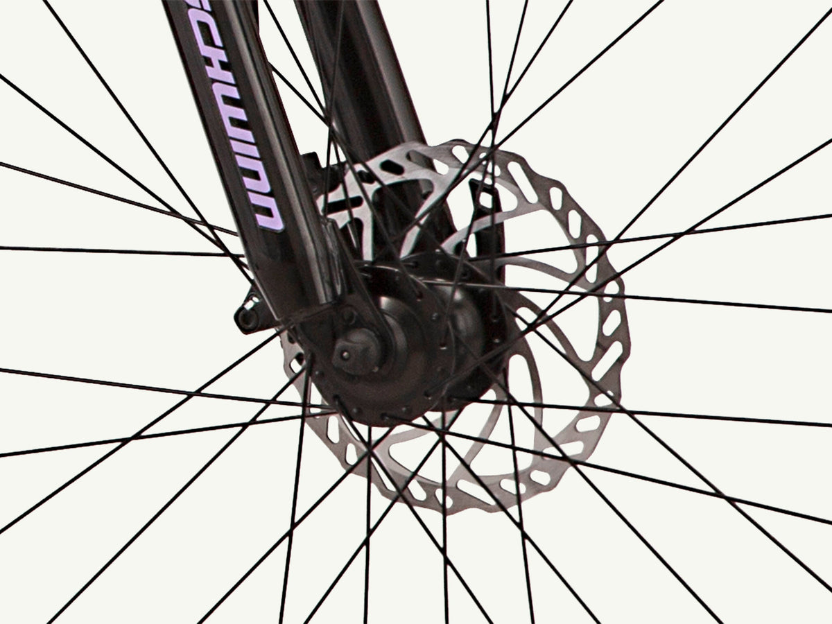 Schwinn aluminum mountain frame delivers controlled riding on tough trails, while the with Schwinn suspension fork helps absorb bumps in the road for a more comfortable ride.